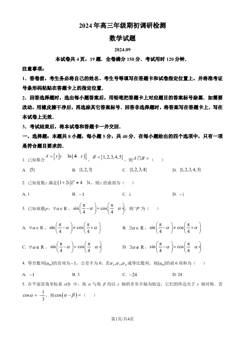 山东省青岛市2024年高三年级9月期初调研检测 数学