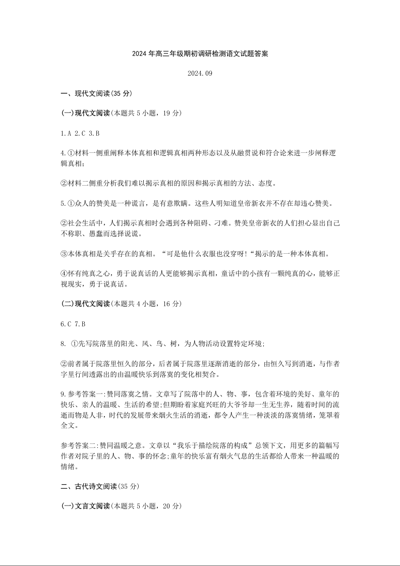 山东省青岛市2024年高三年级9月期初调研检测 语文答案