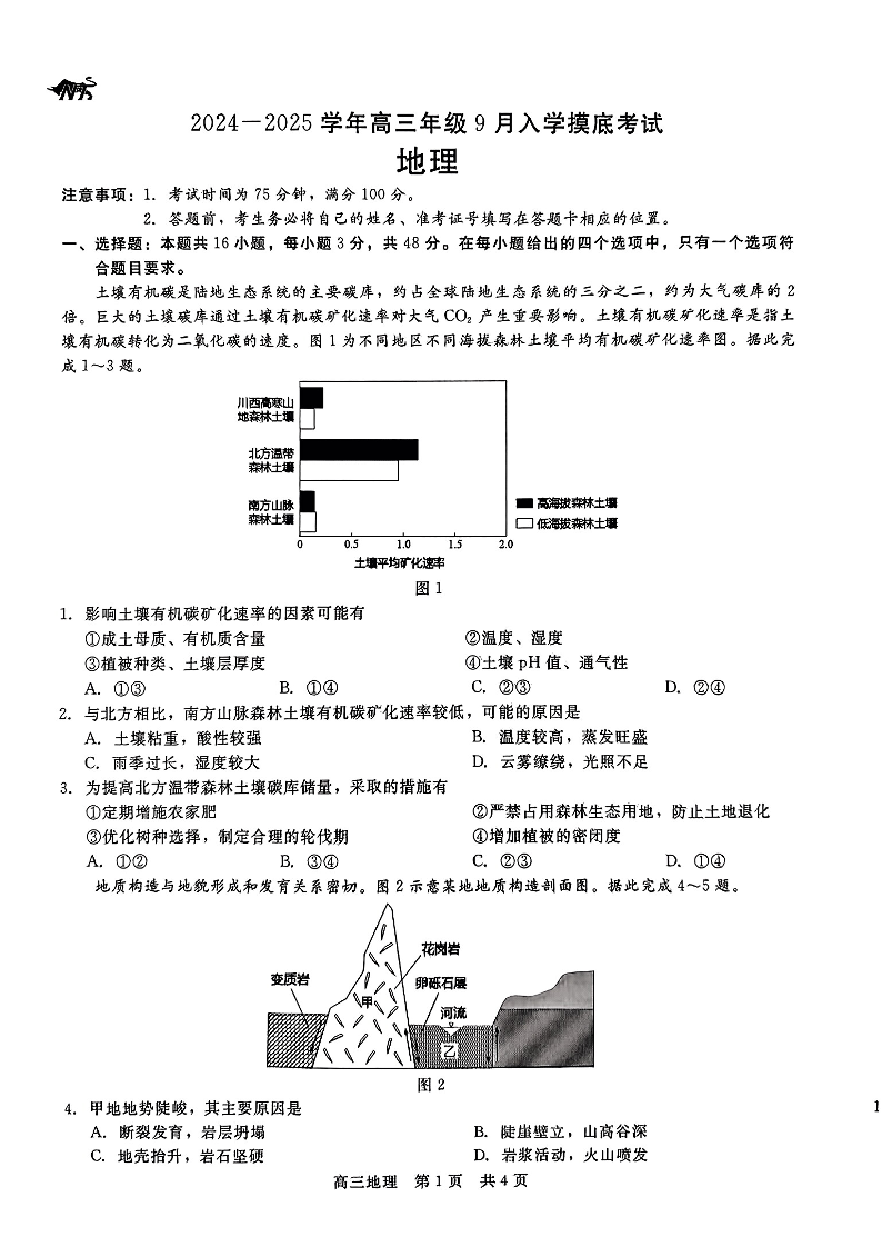 河北省新时代NT教育2024-2025学年高三入学摸底测试 地理
