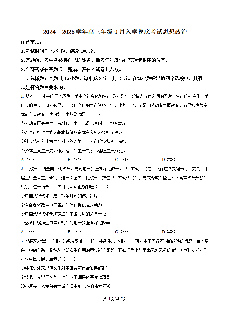 河北省新时代NT教育2024-2025学年高三入学摸底测试 政治