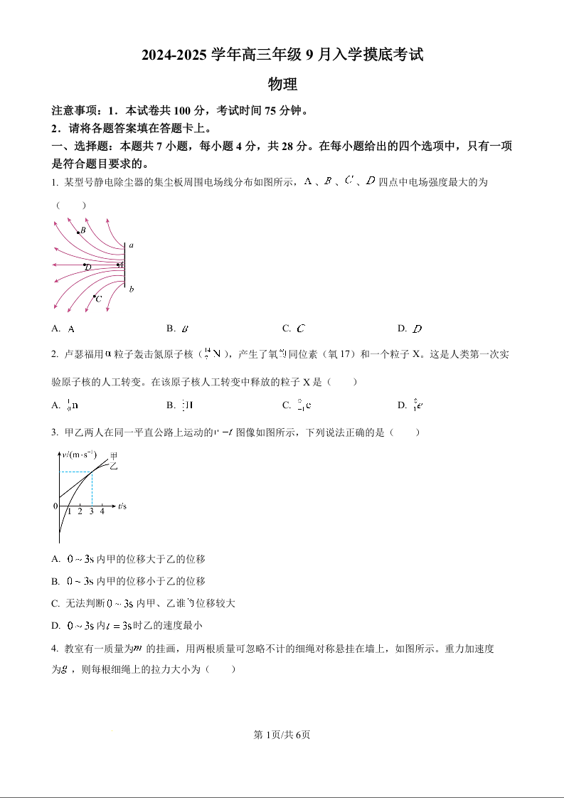 河北省新时代NT教育2024-2025学年高三入学摸底测试 物理