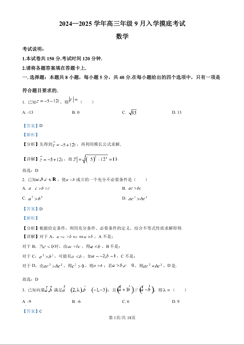 河北省新时代NT教育2024-2025学年高三入学摸底测试 数学答案