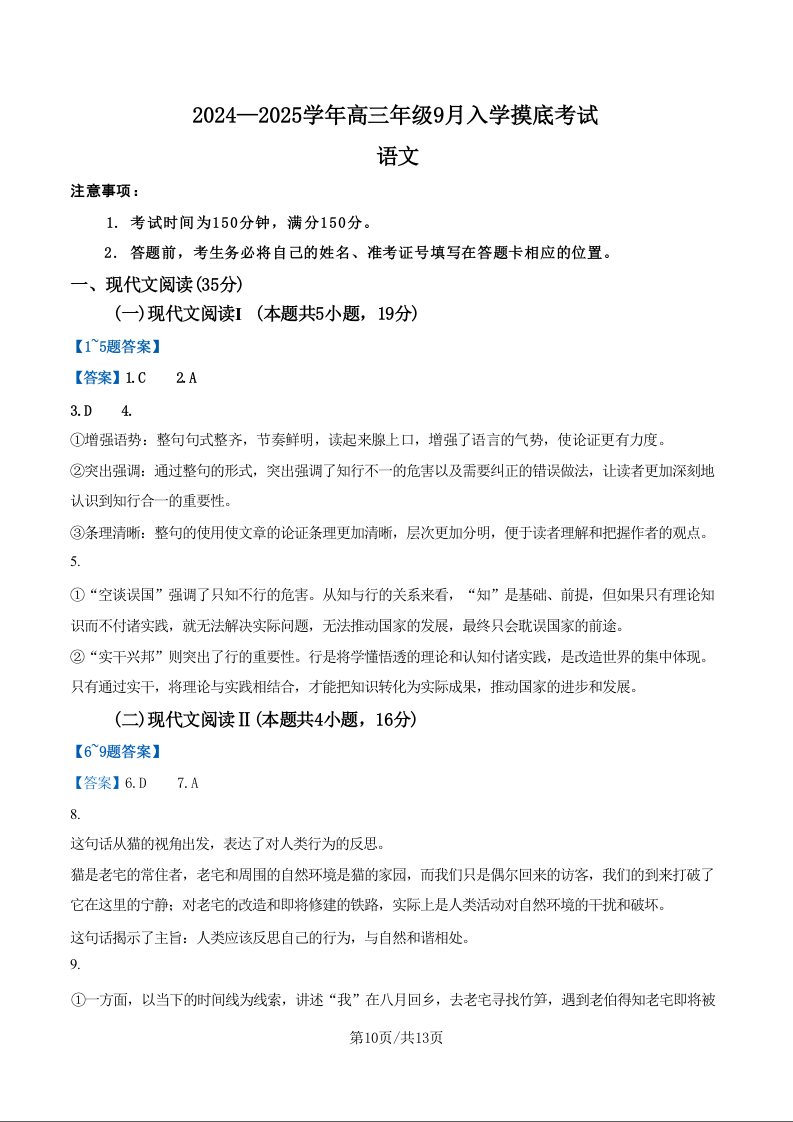 河北省新时代NT教育2024-2025学年高三入学摸底测试 语文答案