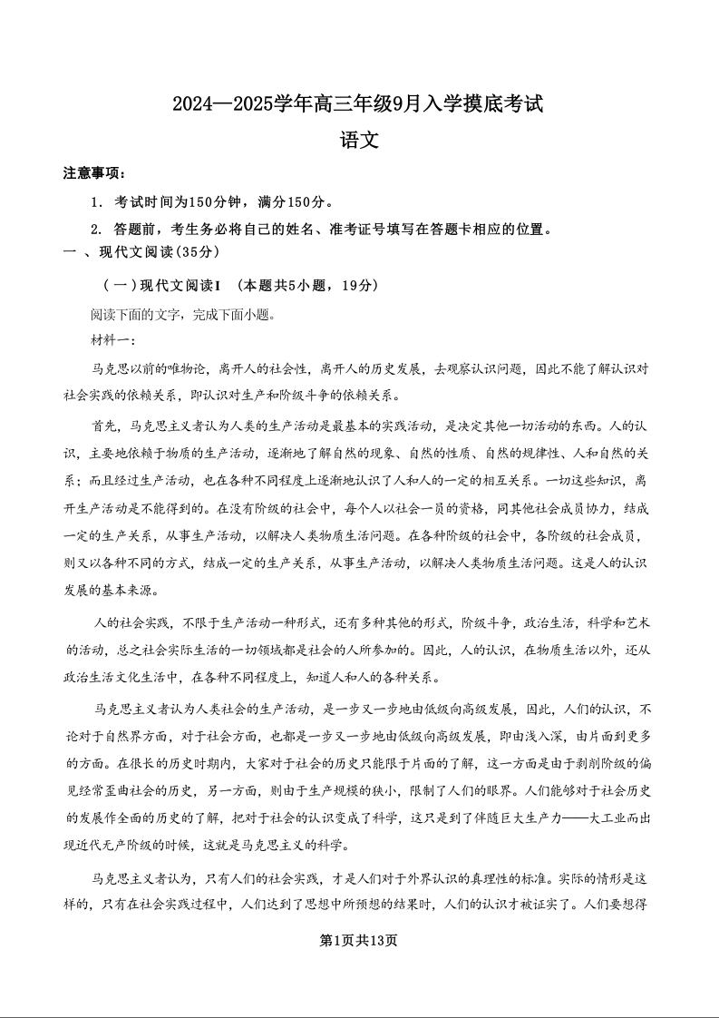 河北省新时代NT教育2024-2025学年高三入学摸底测试 语文