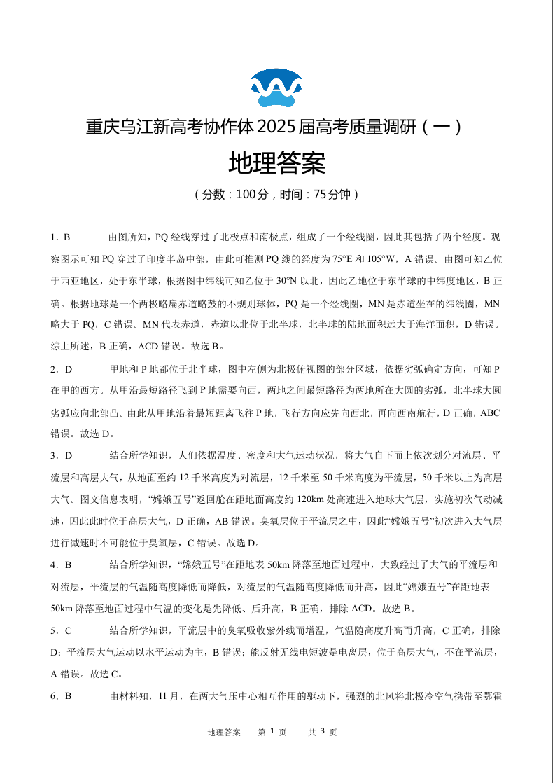 重庆乌江新高考协作体2025届高考质量调研(一)地理答案