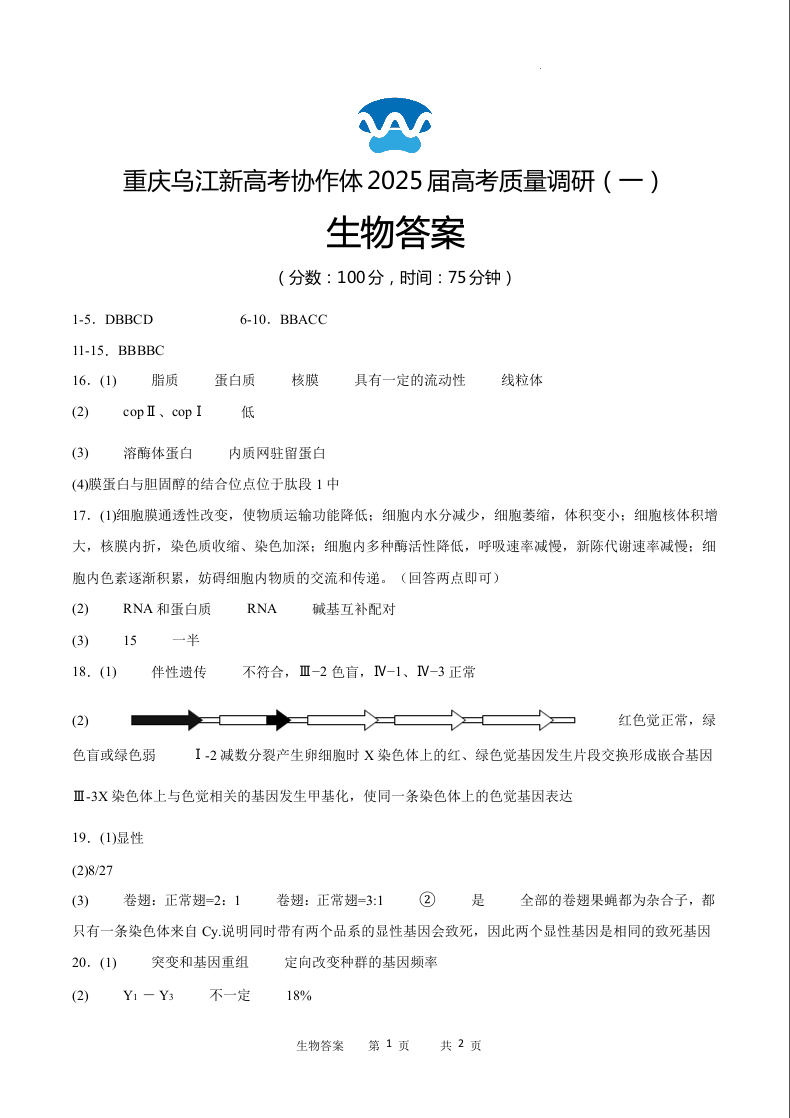 重庆乌江新高考协作体2025届高考质量调研(一)生物答案