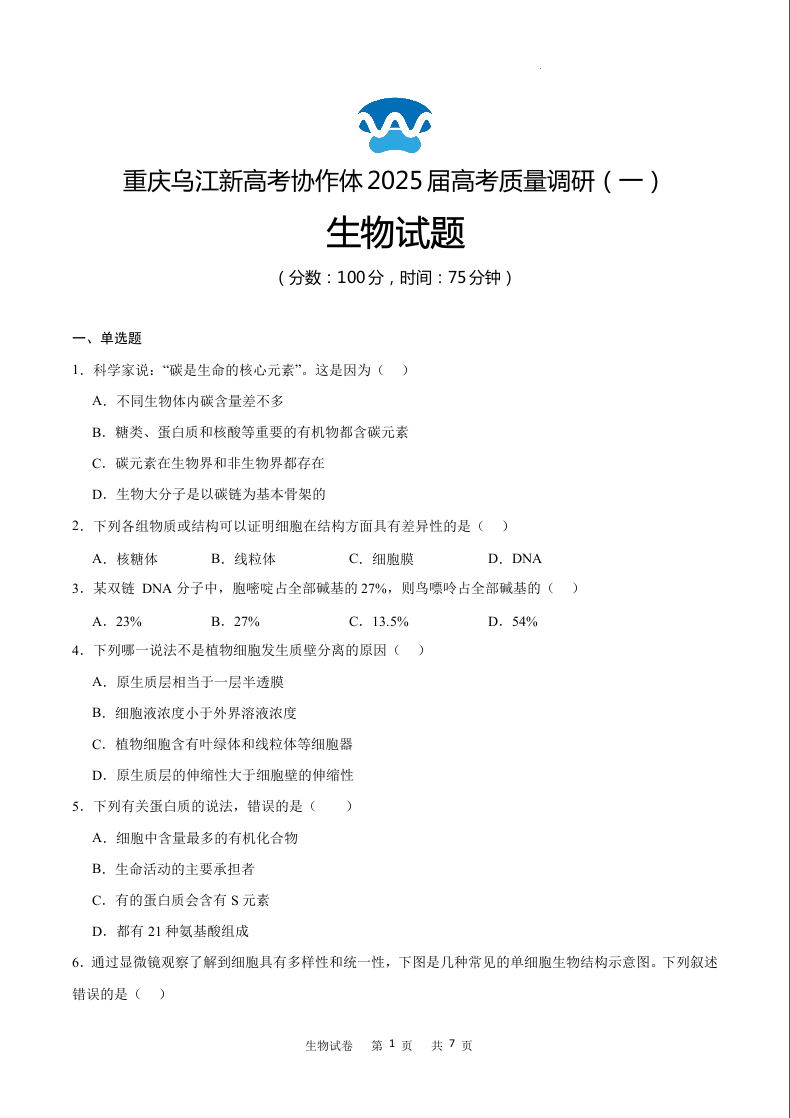 重庆乌江新高考协作体2025届高考质量调研(一)生物