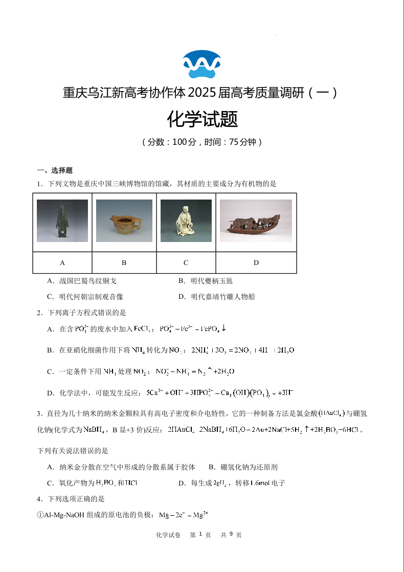 重庆乌江新高考协作体2025届高考质量调研(一)化学