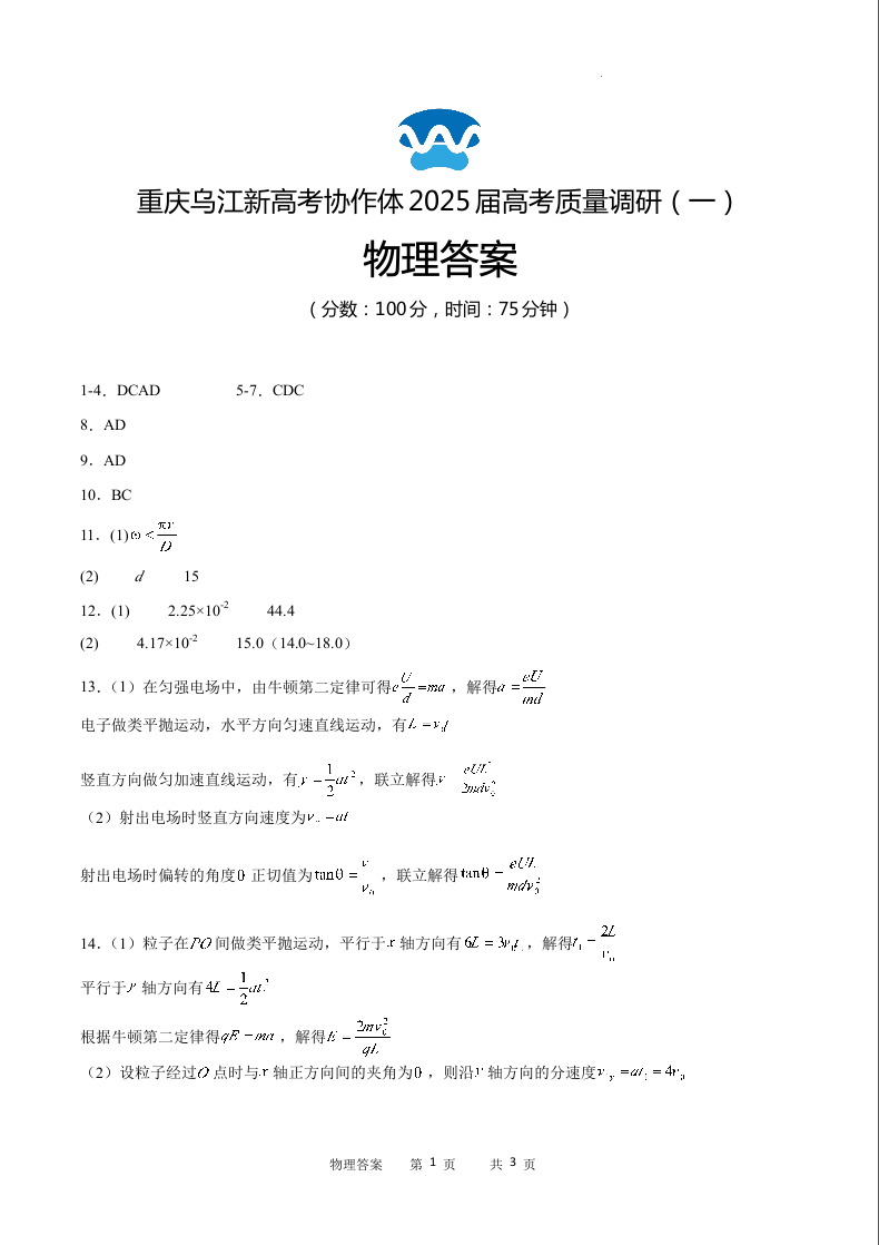 重庆乌江新高考协作体2025届高考质量调研(一)物理答案