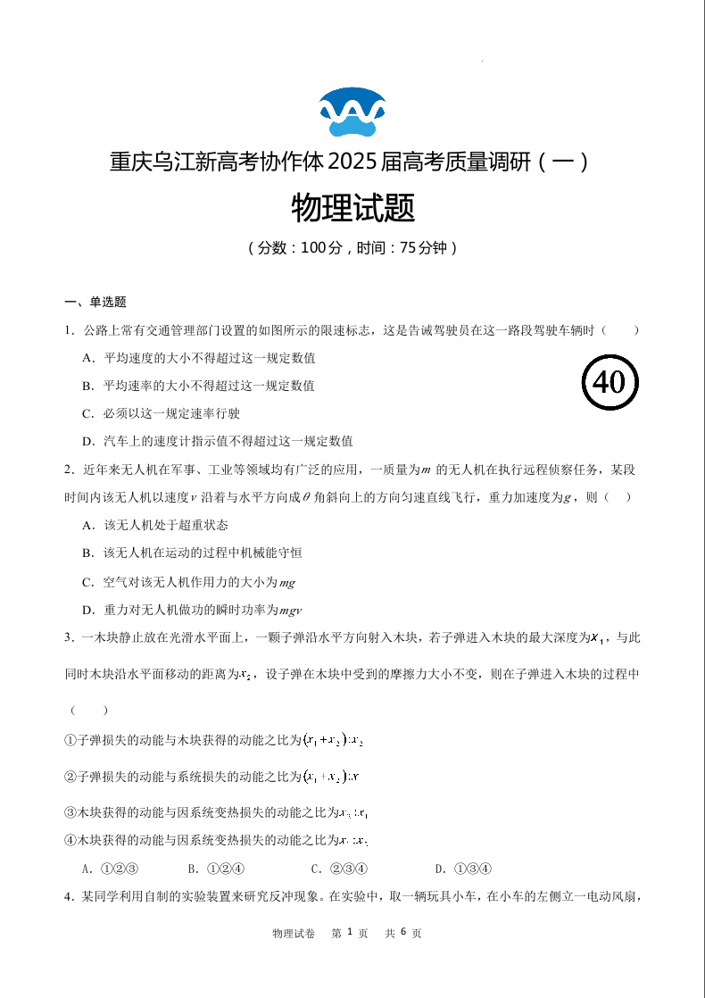 重庆乌江新高考协作体2025届高考质量调研(一)物理