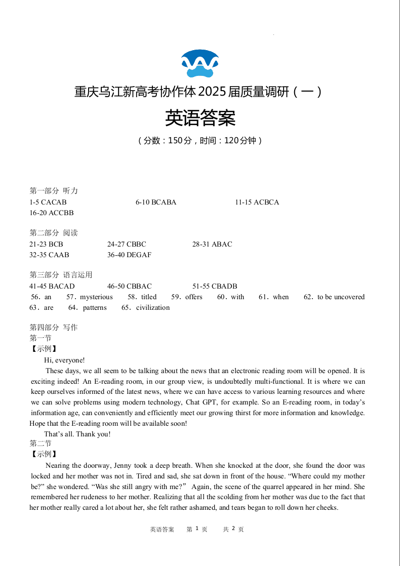 重庆乌江新高考协作体2025届高考质量调研(一)英语答案