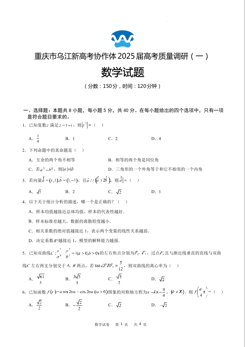 重庆乌江新高考协作体2025届高考质量调研(一)数学