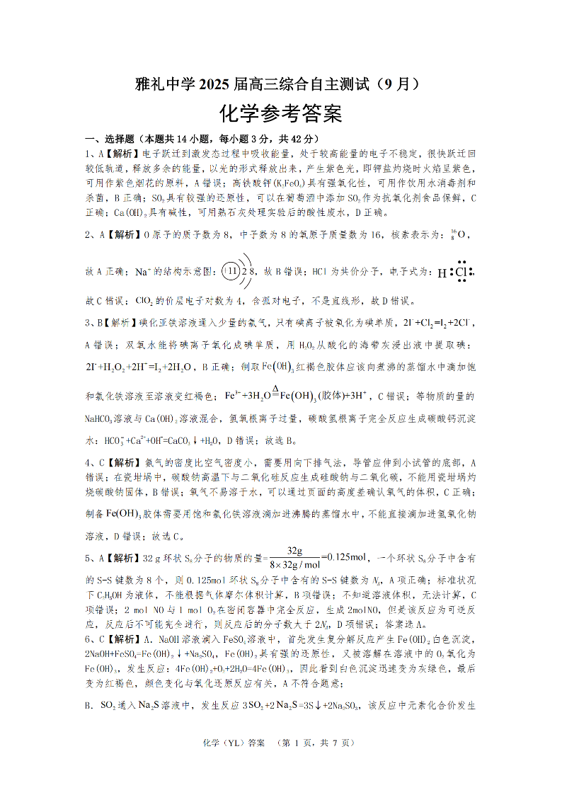 湖南省雅礼中学2025届高三综合自主测试(9月) 化学答案