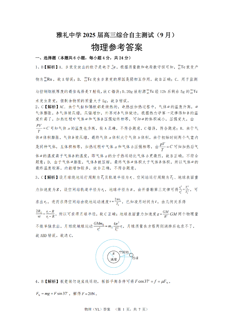 湖南省雅礼中学2025届高三综合自主测试(9月) 物理答案