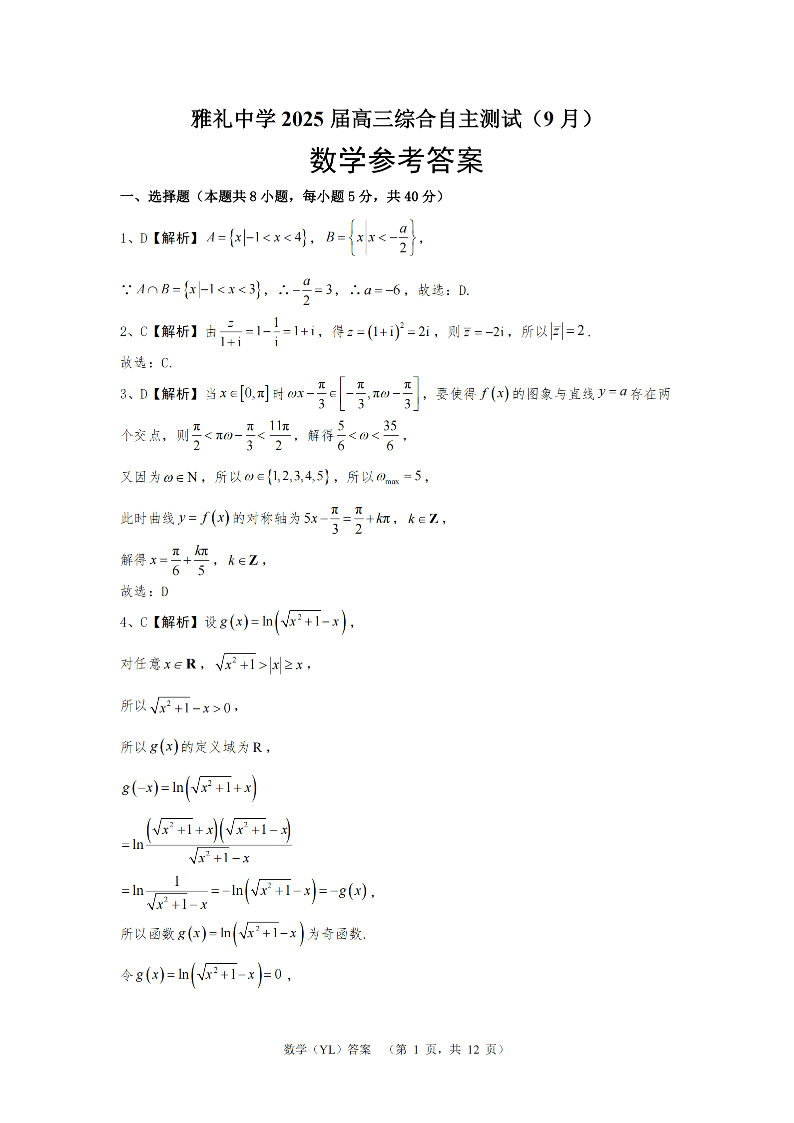 湖南省雅礼中学2025届高三综合自主测试(9月) 数学答案