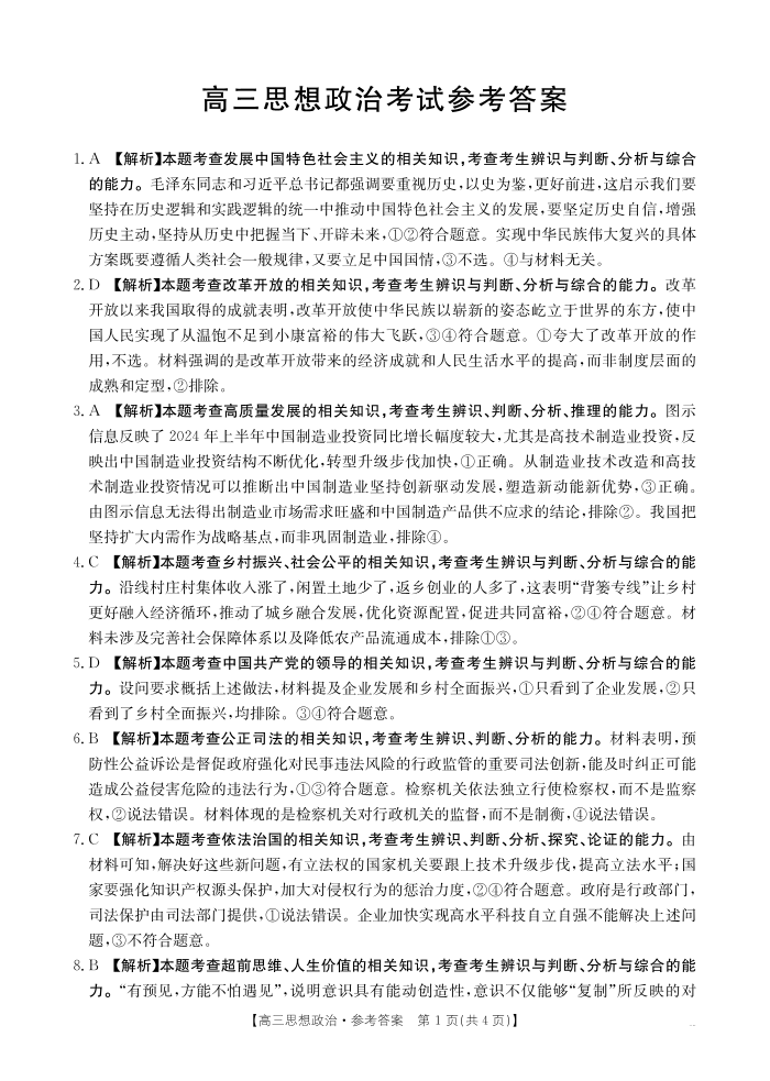 广西部分示范性高中2025届高三上学期摸底质检 政治答案