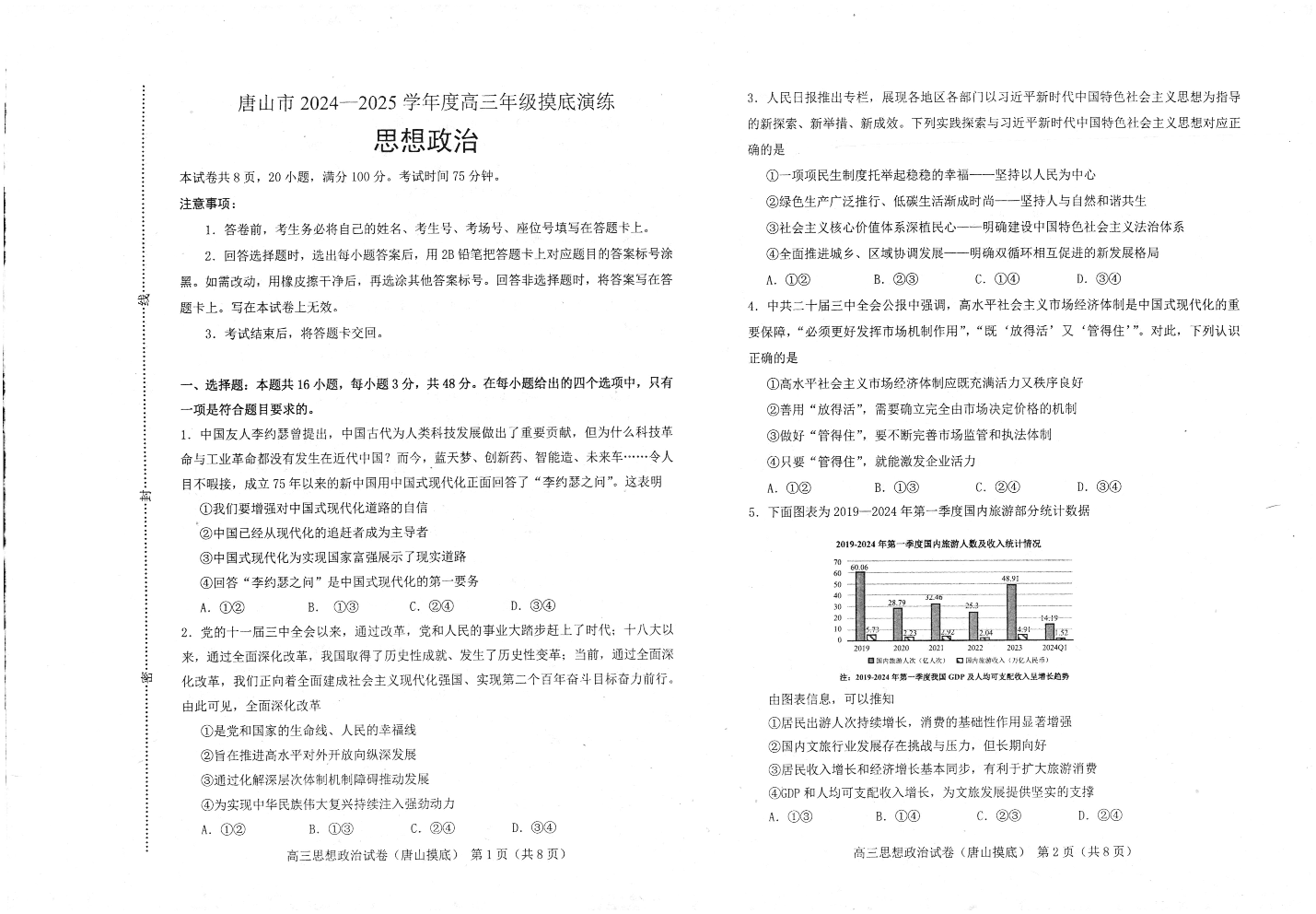 河北省唐山市2024-2025学年高三上学期摸底演练 政治
