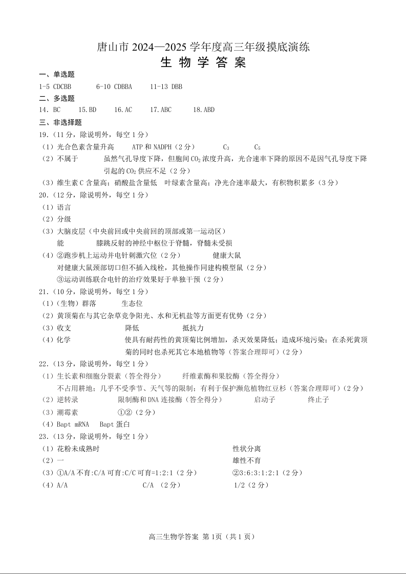 河北省唐山市2024-2025学年高三上学期摸底演练 生物答案