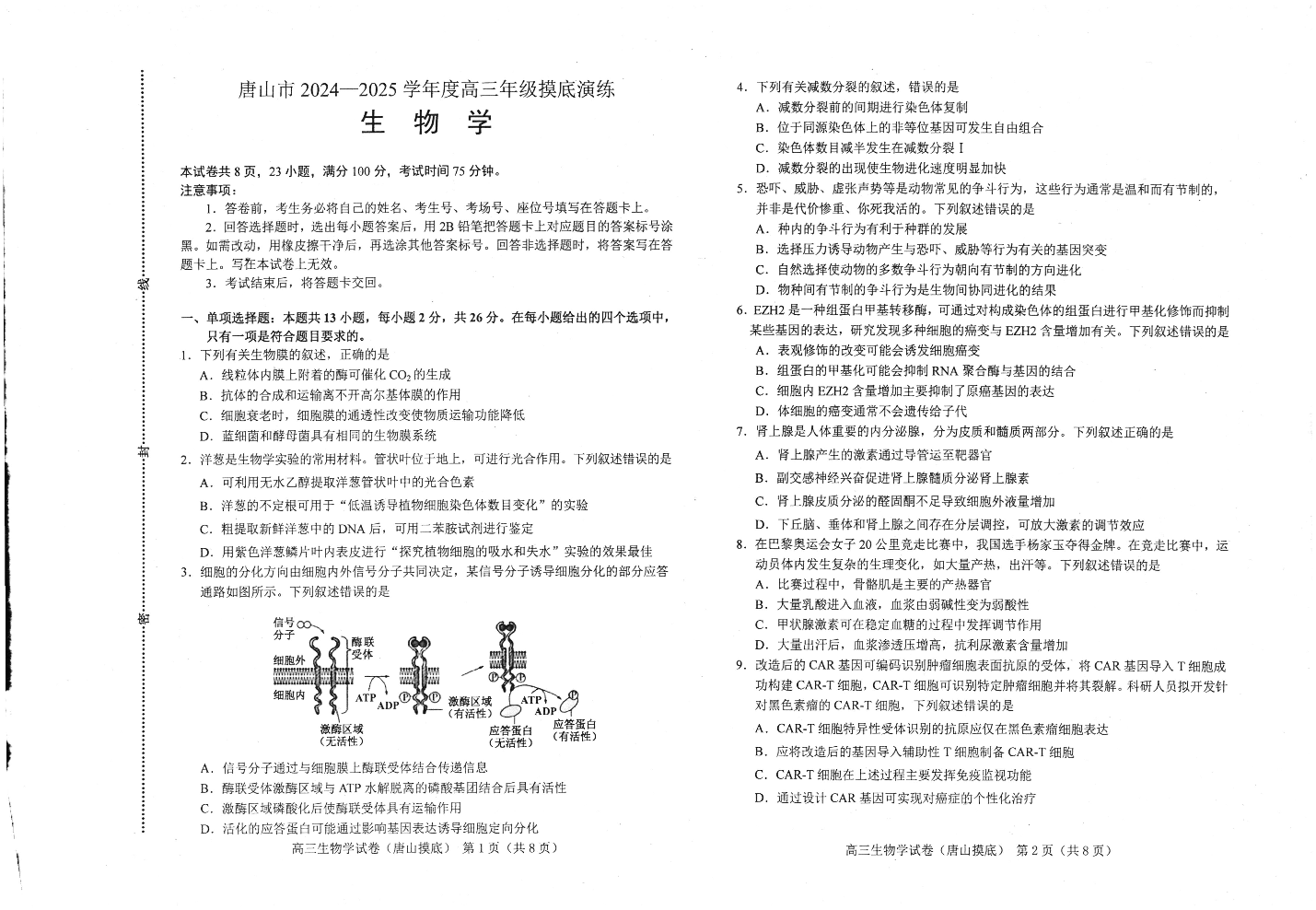 河北省唐山市2024-2025学年高三上学期摸底演练 生物