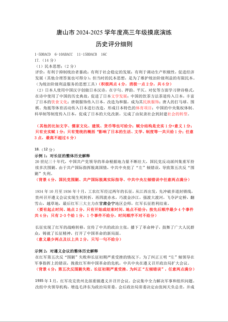 河北省唐山市2024-2025学年高三上学期摸底演练 历史答案