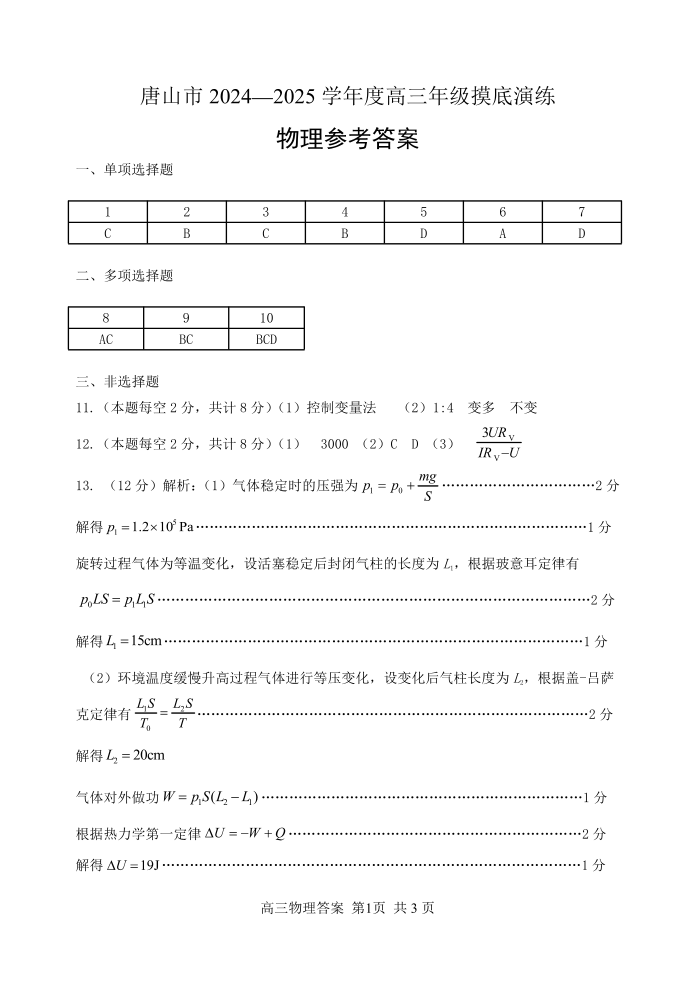 河北省唐山市2024-2025学年高三上学期摸底演练 物理答案