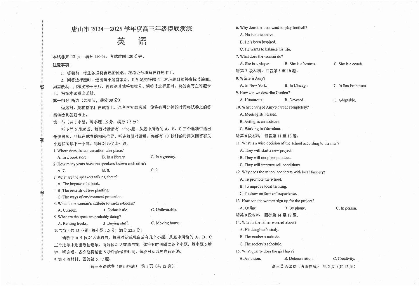 河北省唐山市2024-2025学年高三上学期摸底演练 英语