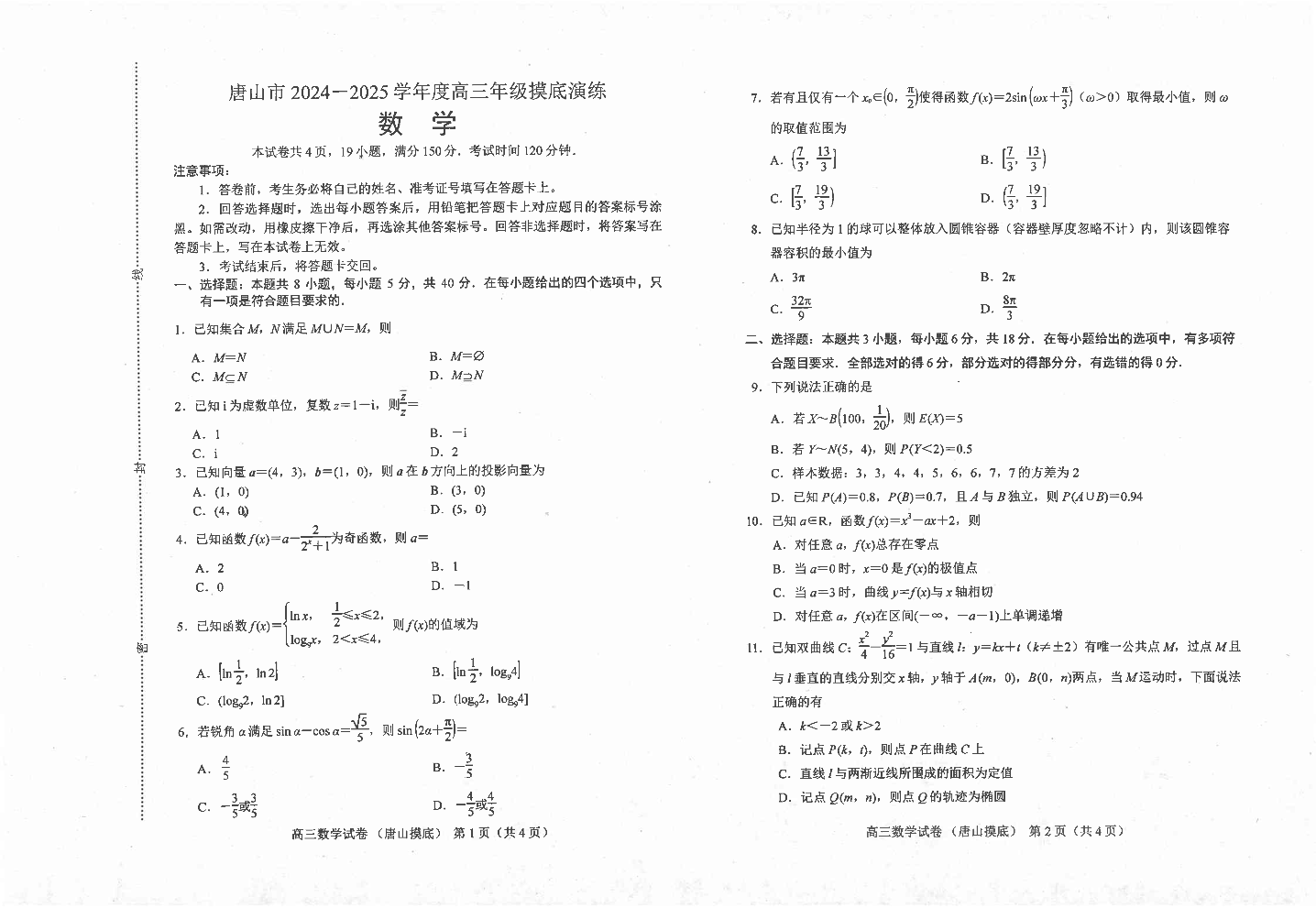 河北省唐山市2024-2025学年高三上学期摸底演练 数学