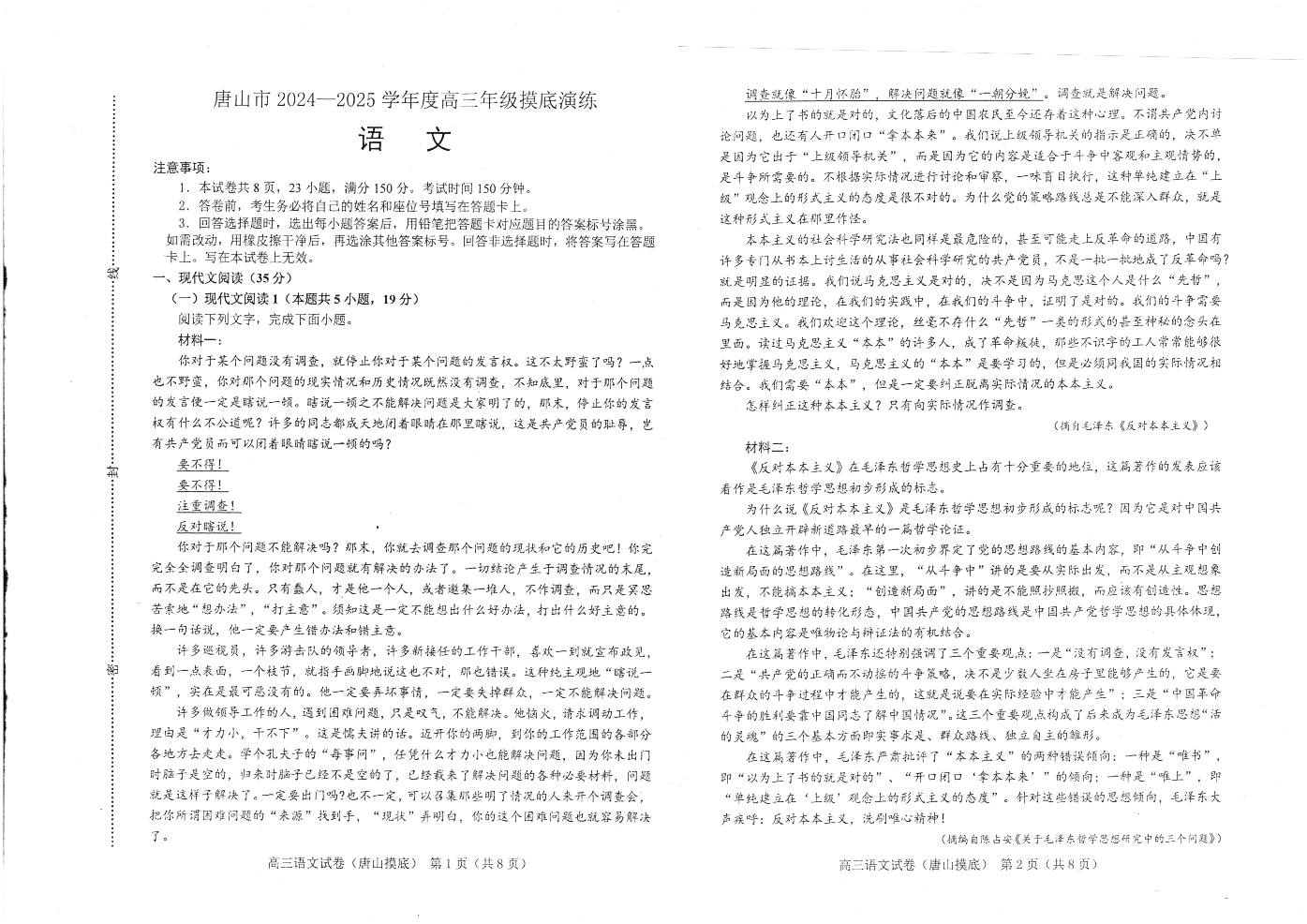 河北省唐山市2024-2025学年高三上学期摸底演练 语文