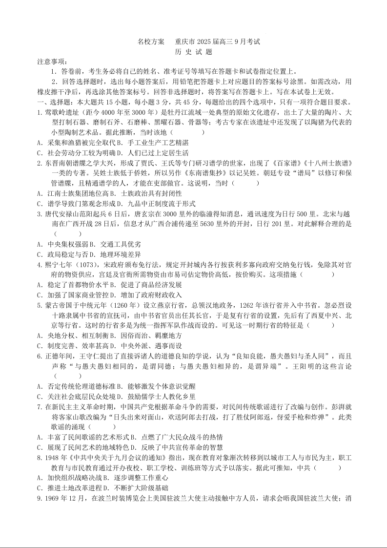 重庆市名校方案2025届高三上学期9月联考考试 历史