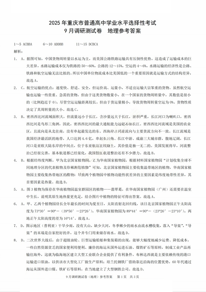2025年重庆市普通高中学业水平选择性考试9月调研试卷 地理答案