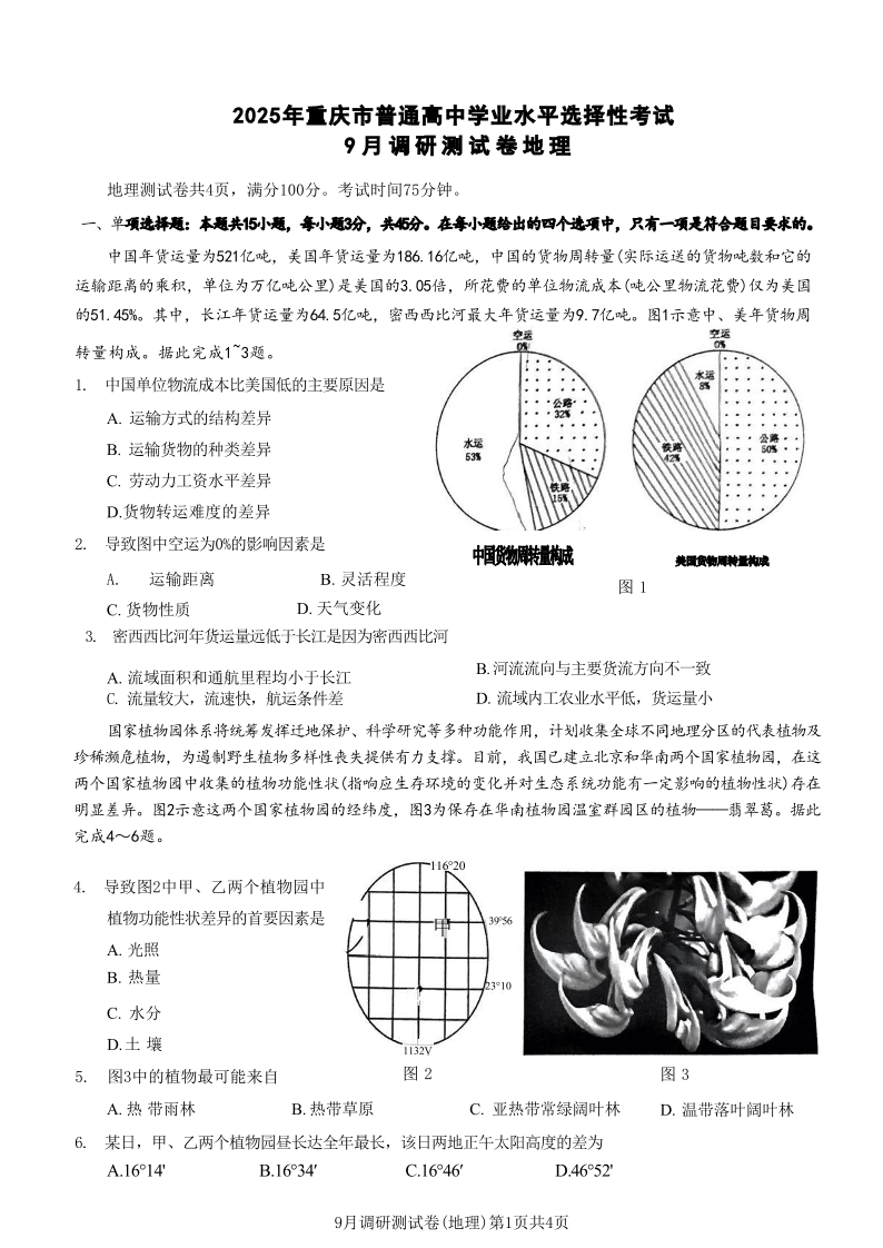 2025年重庆市普通高中学业水平选择性考试9月调研试卷 地理