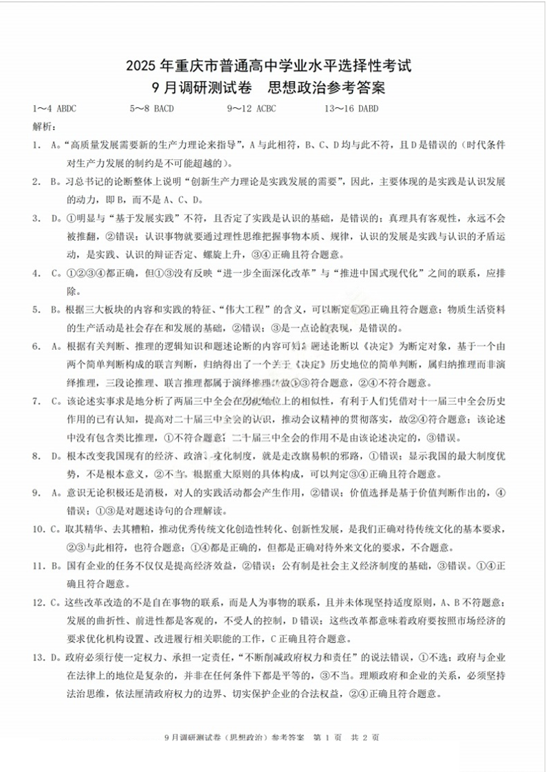 2025年重庆市普通高中学业水平选择性考试9月调研试卷 政治答案
