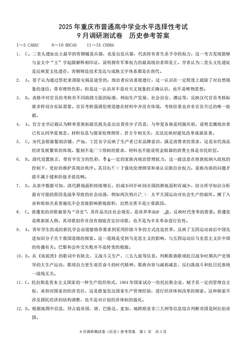 2025年重庆市普通高中学业水平选择性考试9月调研试卷 历史答案