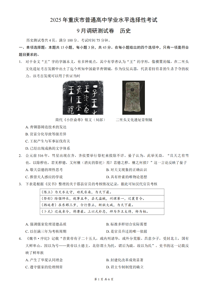 2025年重庆市普通高中学业水平选择性考试9月调研试卷 历史