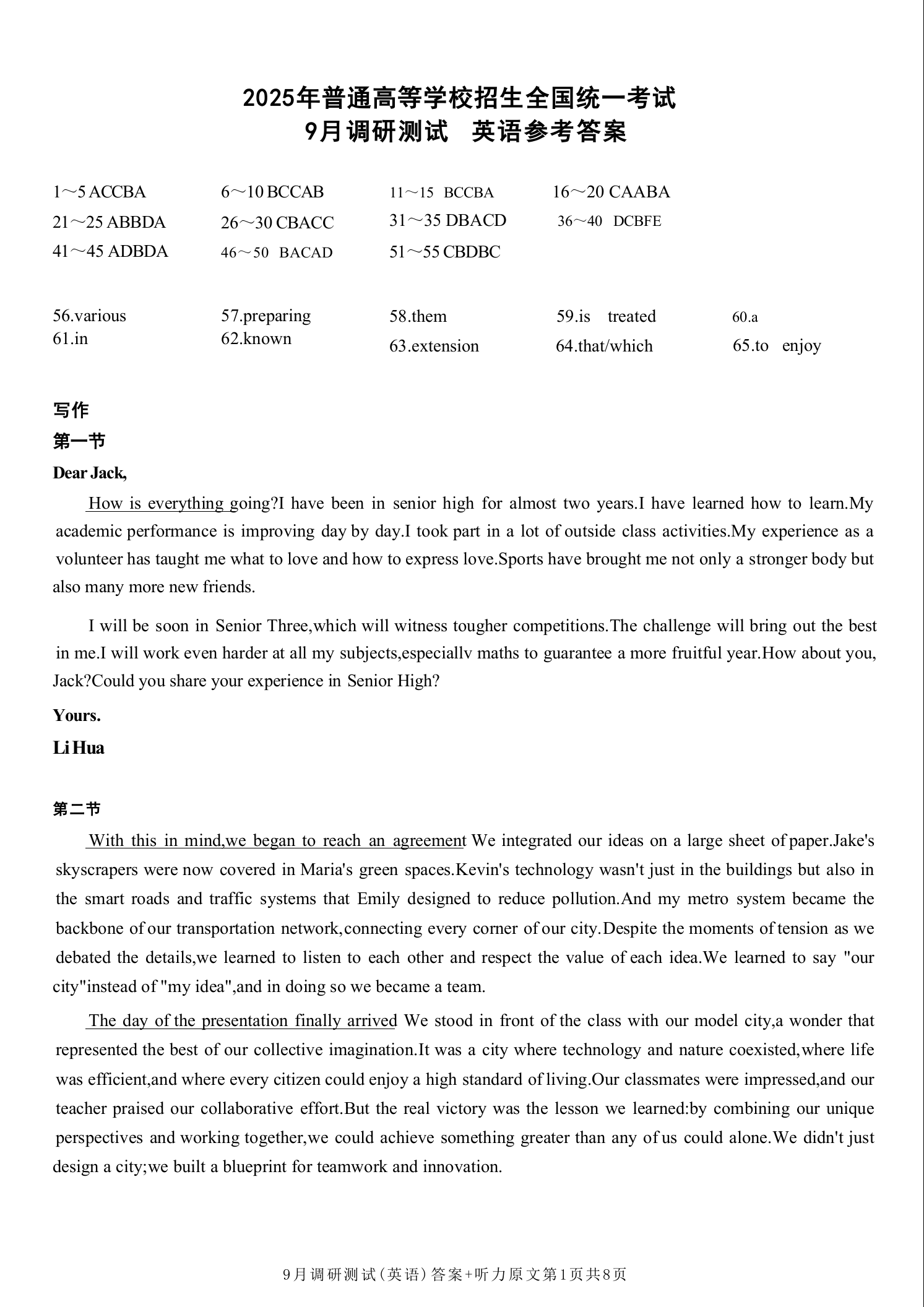 2025年重庆市普通高中学业水平选择性考试9月调研试卷 英语答案