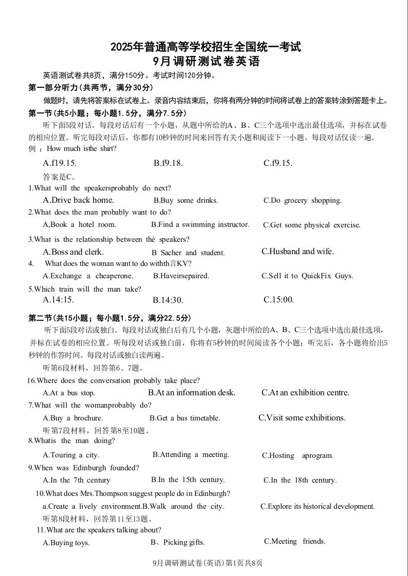 2025年重庆市普通高中学业水平选择性考试9月调研试卷 英语