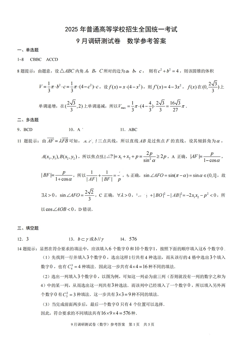 2025年重庆市普通高中学业水平选择性考试9月调研试卷 数学答案