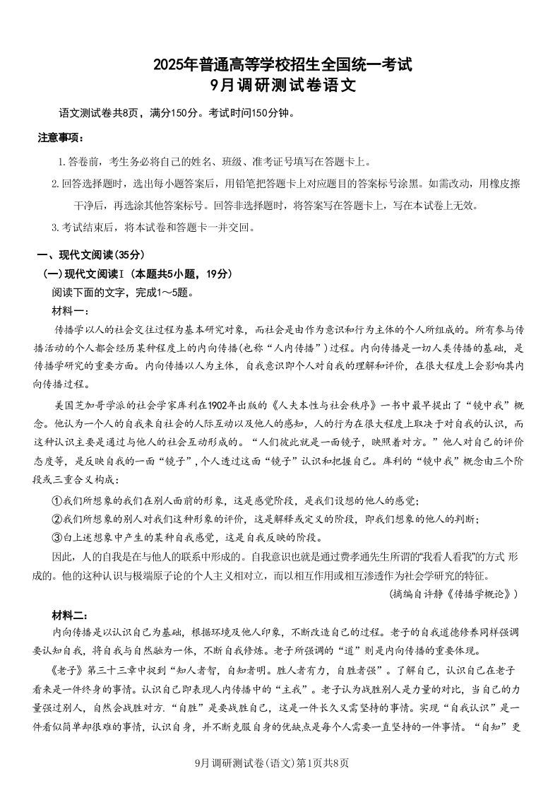 2025年重庆市普通高中学业水平选择性考试9月调研试卷 语文