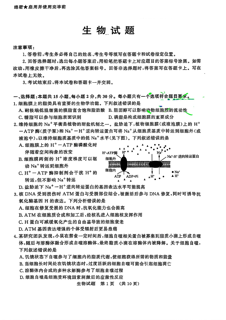 山东省济南市2024-2025学年高三九月摸底考试 生物