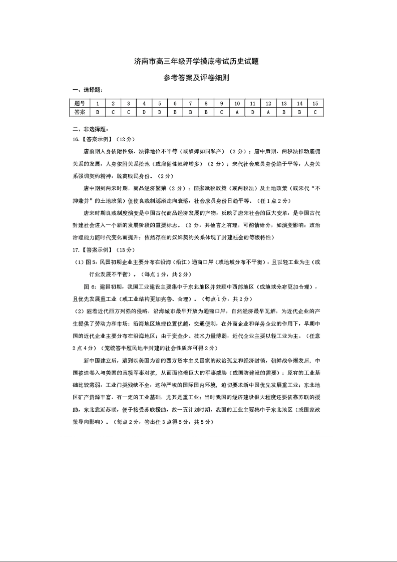 山东省济南市2024-2025学年高三九月摸底考试 历史答案