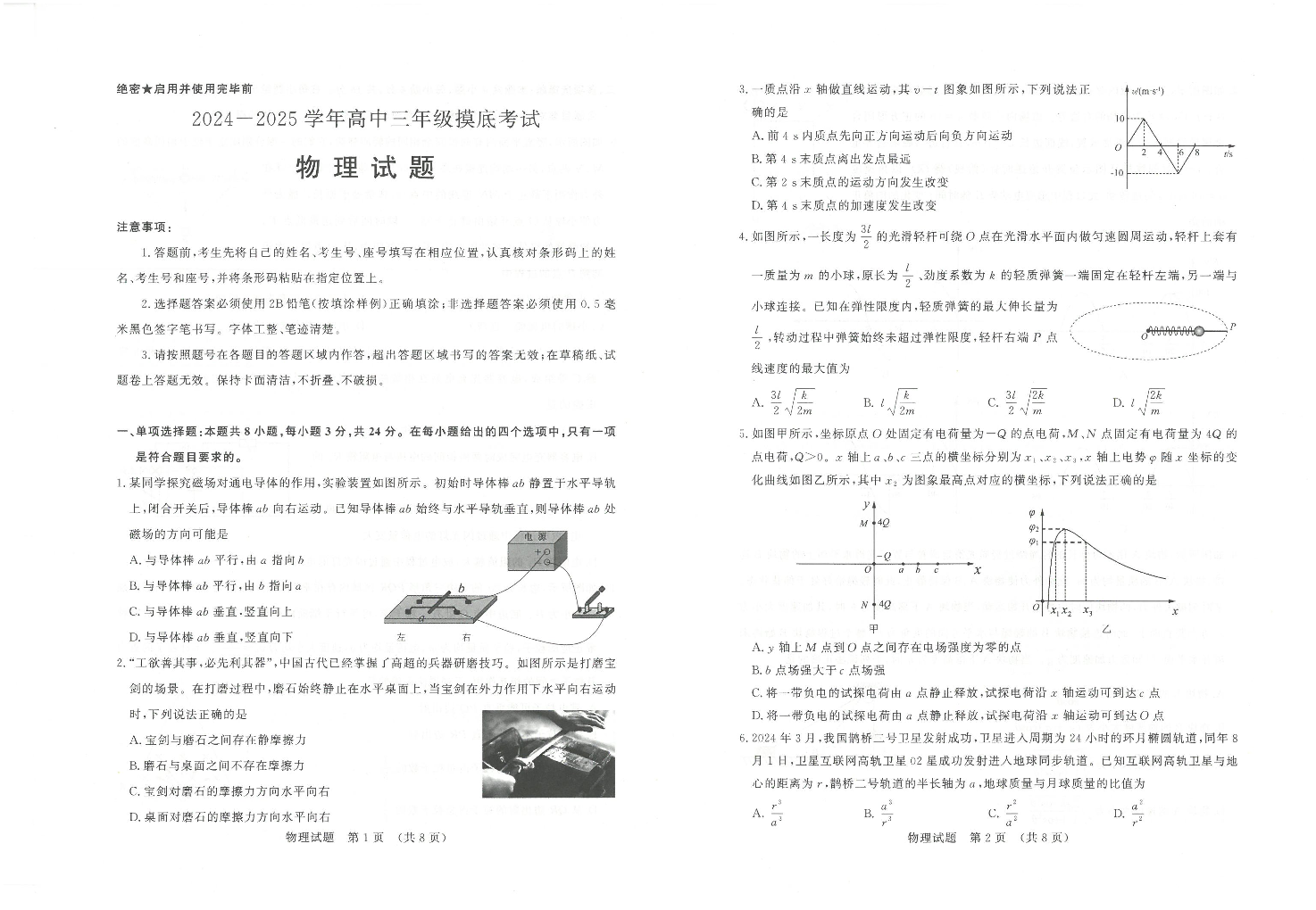 山东省济南市2024-2025学年高三九月摸底考试 物理