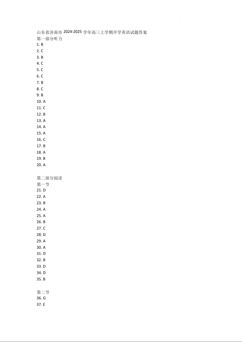山东省济南市2024-2025学年高三九月摸底考试 英语答案