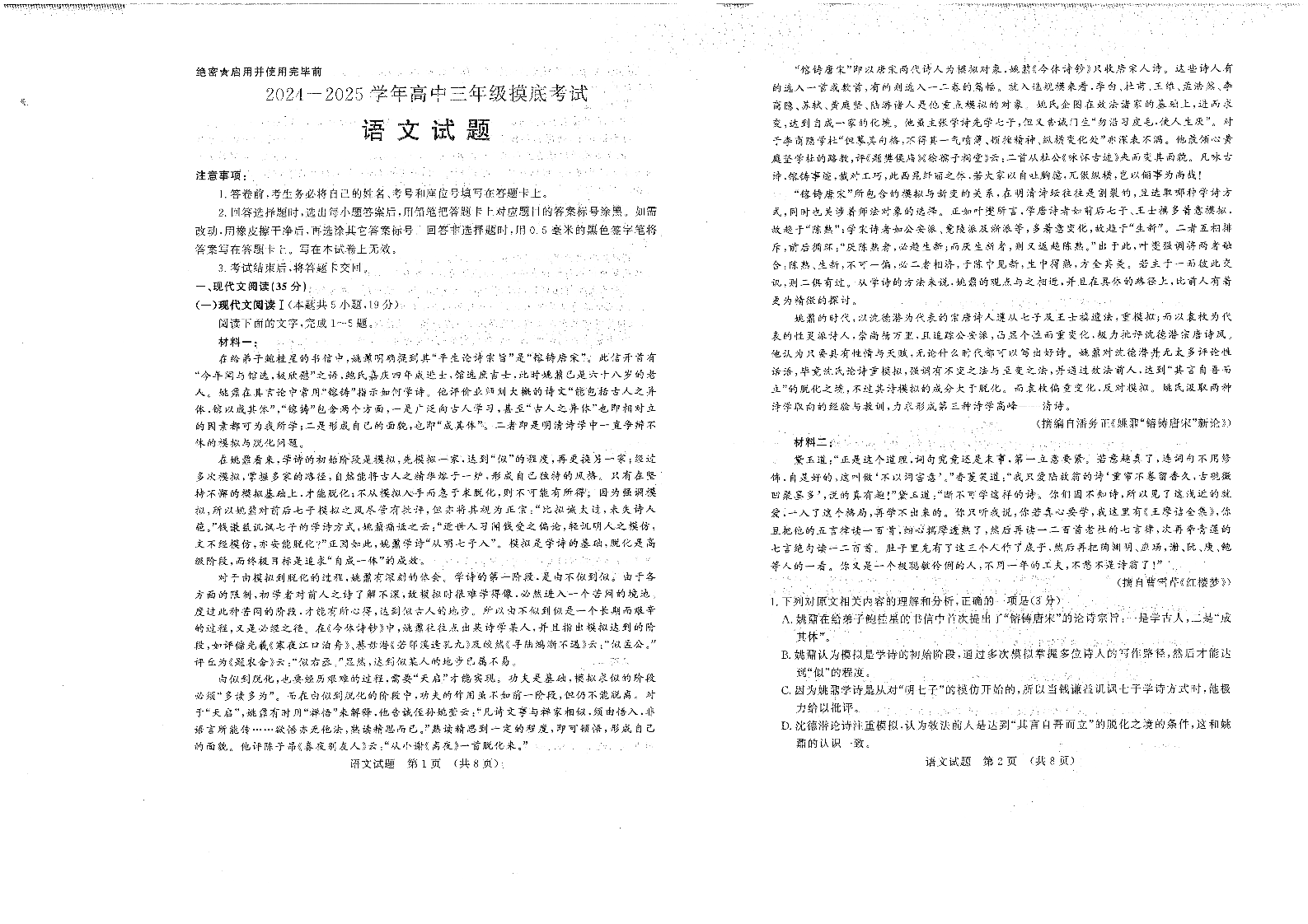 山东省济南市2024-2025学年高三九月摸底考试 语文