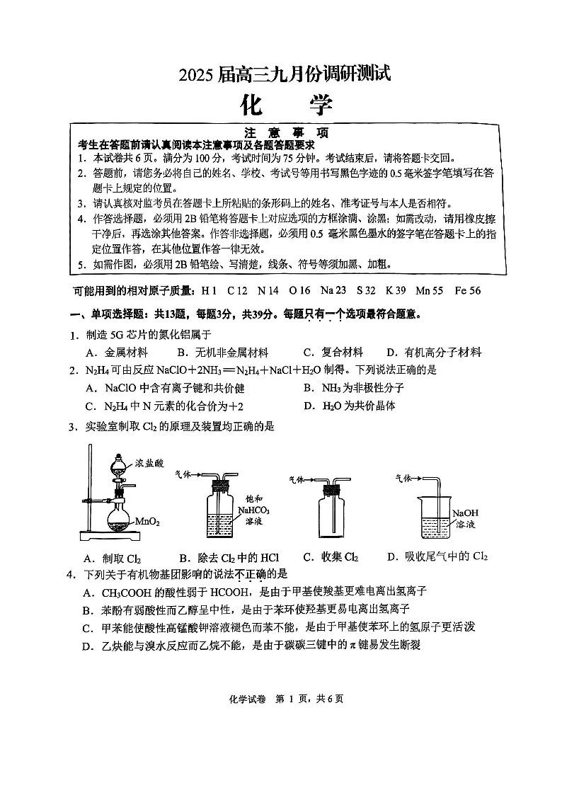 江苏省南通市2025届高三九月份调研测试 化学