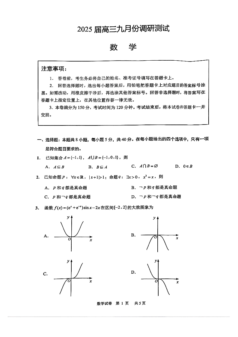 江苏省南通市2025届高三九月份调研测试 数学