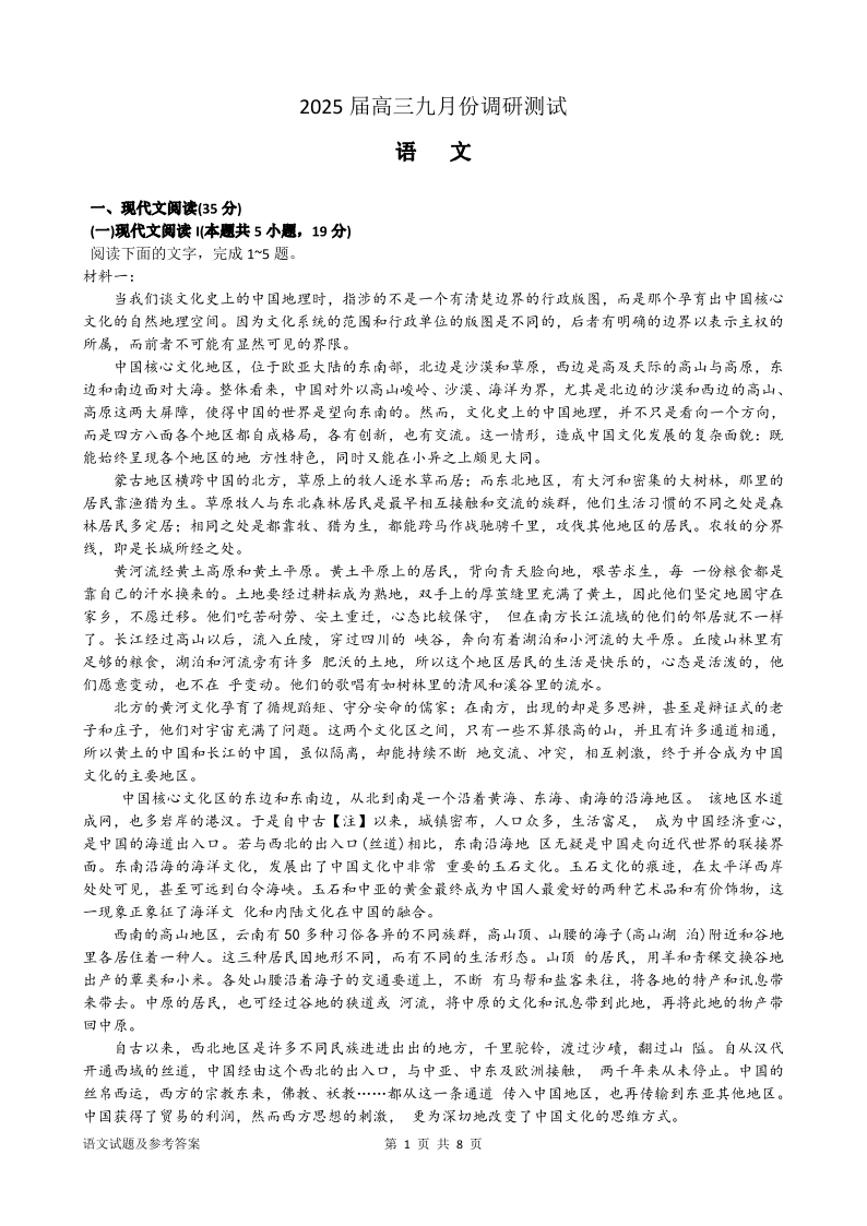 江苏省南通市2025届高三九月份调研测试 语文