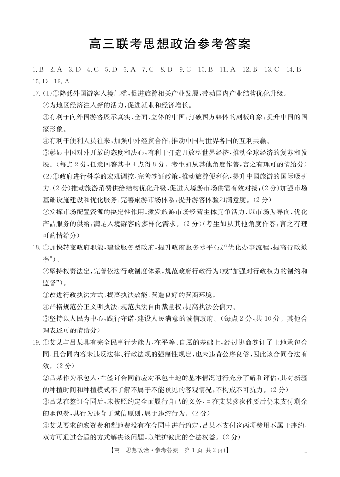 贵州省部分学校2024-2025学年高三9月开学联考 政治答案