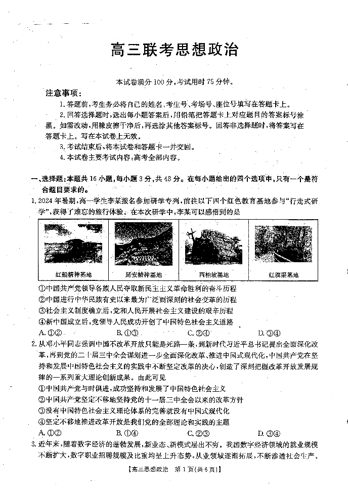 贵州省部分学校2024-2025学年高三9月开学联考 政治