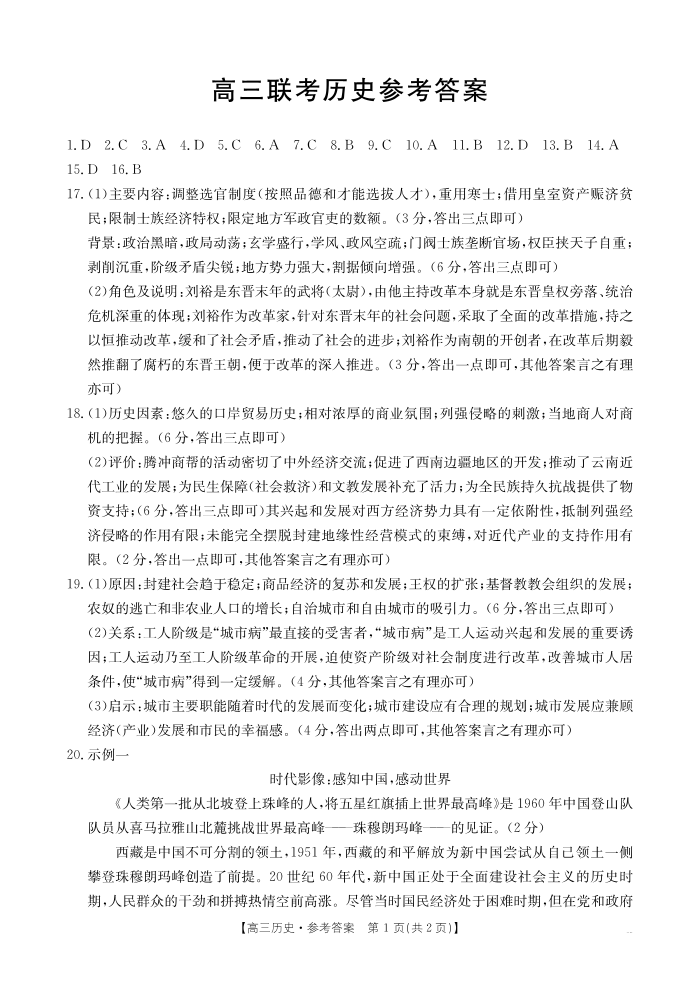 贵州省部分学校2024-2025学年高三9月开学联考 历史答案