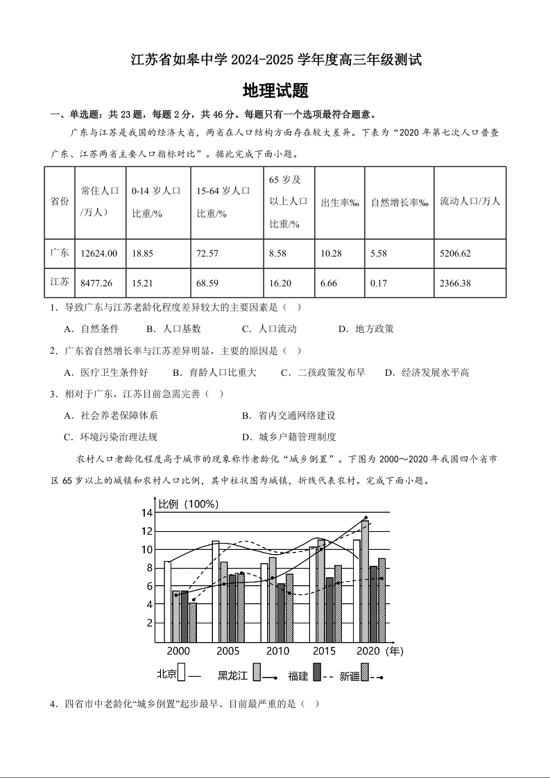江苏省如皋中学2024-2025学年度高三年级期初测试 地理